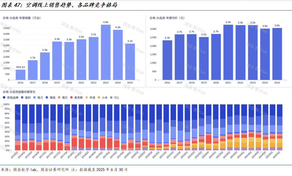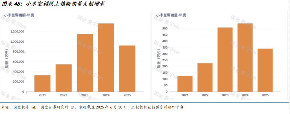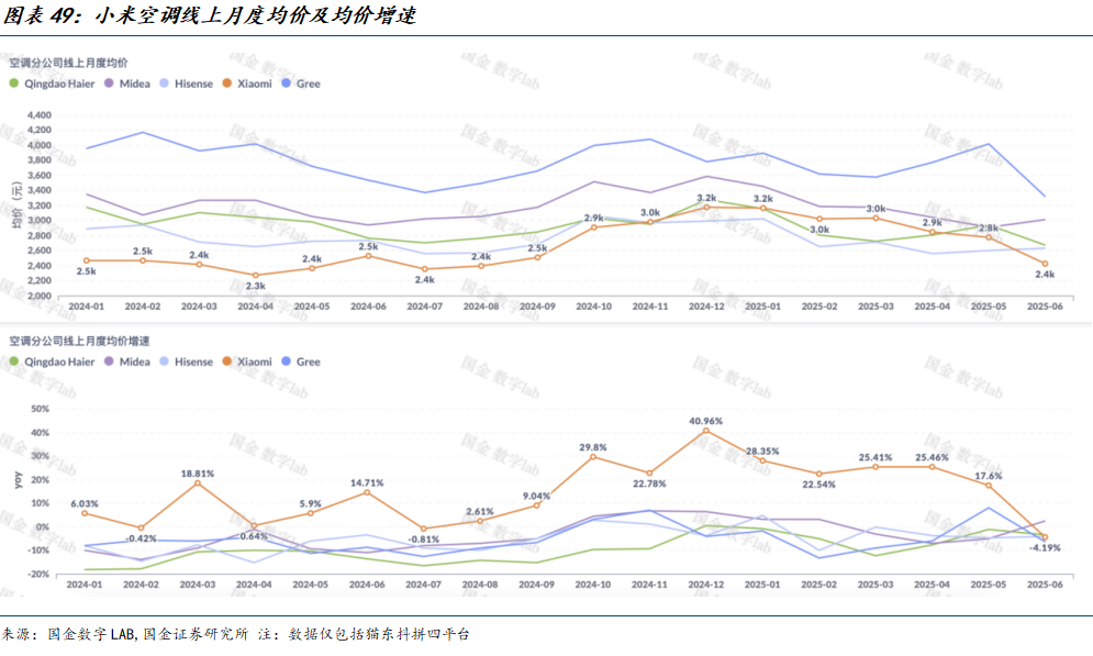 线上数据来看,小米空调在2024年全年空调品类销量下滑情况下,逆势增长,份额2024年至今维持10个点以上占比;价格来看,小米空调月均价格增速远高于同行水平,体现其产品力和消费者认可度。