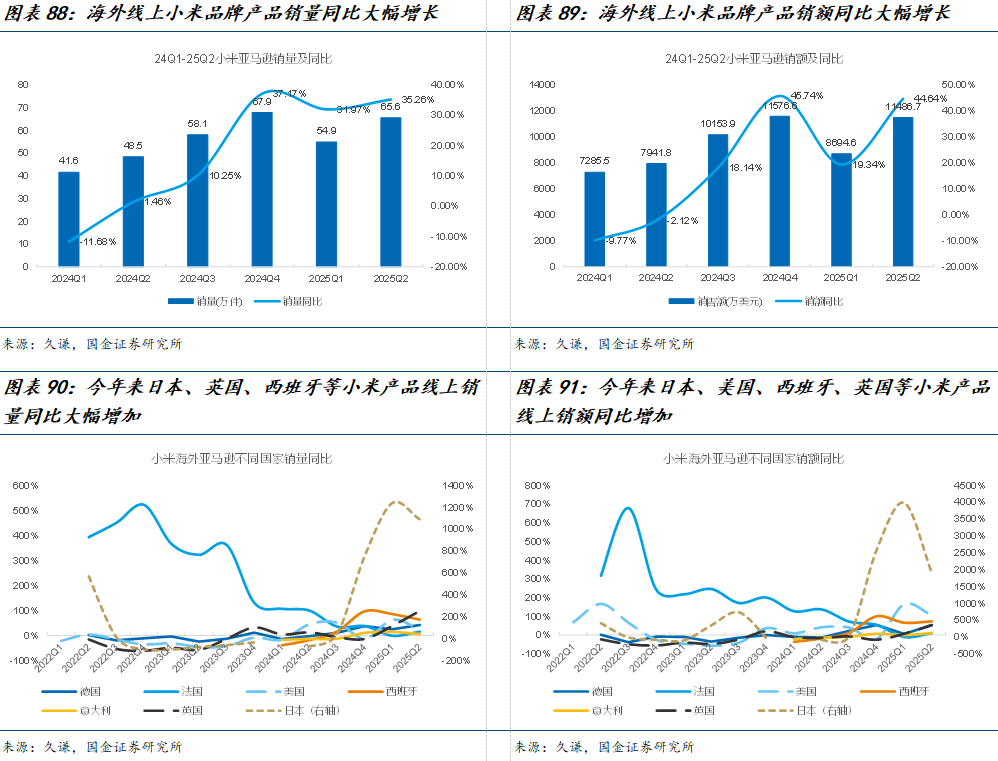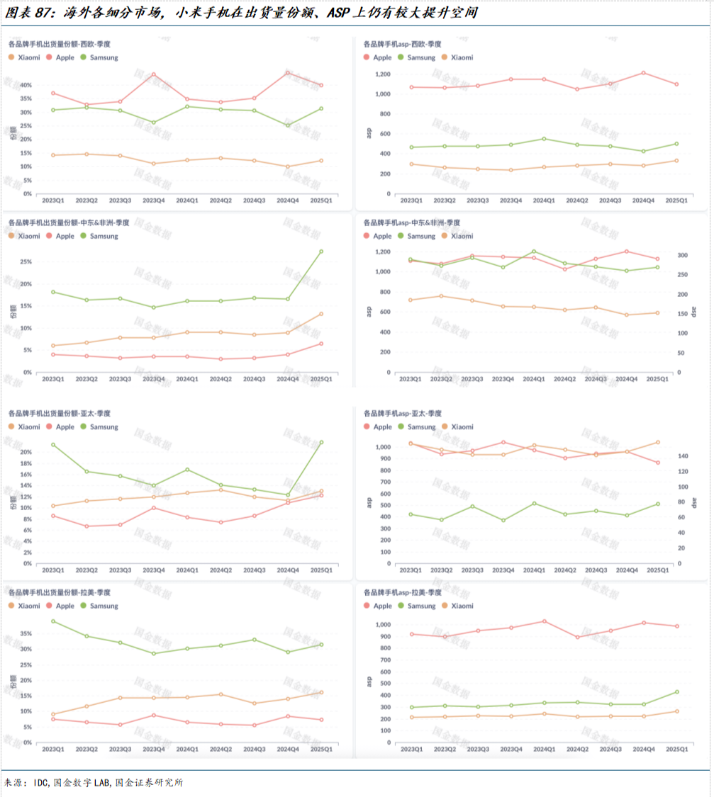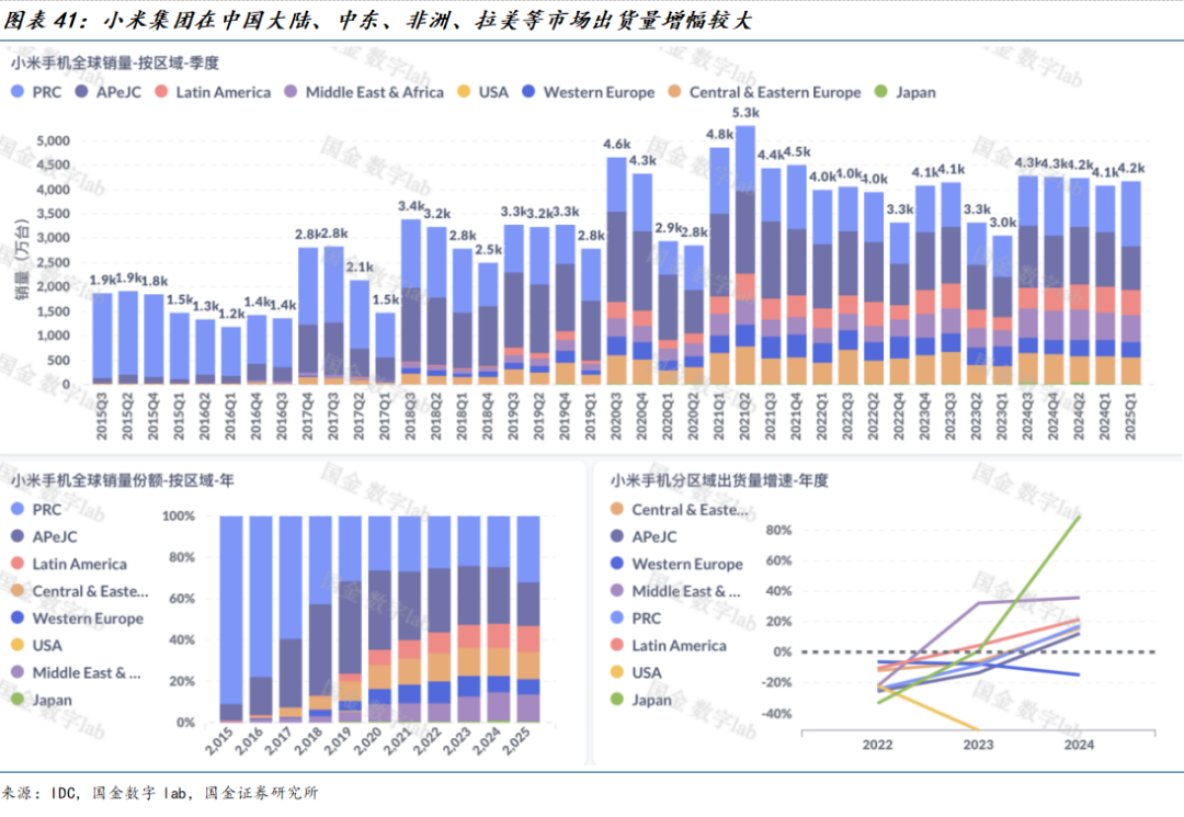 1)东南亚市场人口基数庞大、经济快速增长、互联网普及率提升,消费潜力巨大,有望持续保持高增长态势。近几年东南亚市场逐步优化结构,印度份额下降,泰国、马来西亚、越南等份额增长,使得25Q1在整体市场下降情况下,小米成东南亚市场TOP5品牌中唯一同比增长的品牌,出货量达400万部(同比增长4%),市场份额17%,位居第二,创2019Q2以来最佳排名。2)非洲人口年轻化、智能手机普及率提升,市场空间大,小米针对当地网络差、供电不稳定等情况,推出长续航、大音量、强光下可拍照手机,契合当地需求,增长潜力十分巨大,2025Q1小米在非洲市场份额涨至13%,出货量同比增长32%。拉美地区在通信基础设施逐步完善、居民消费能力提升背景下,也具备较强增长可能性。3)同时,小米对欧洲、中东等成熟市场也积极拓展,加强本地化运营。