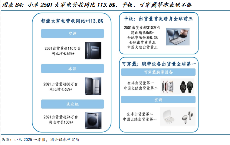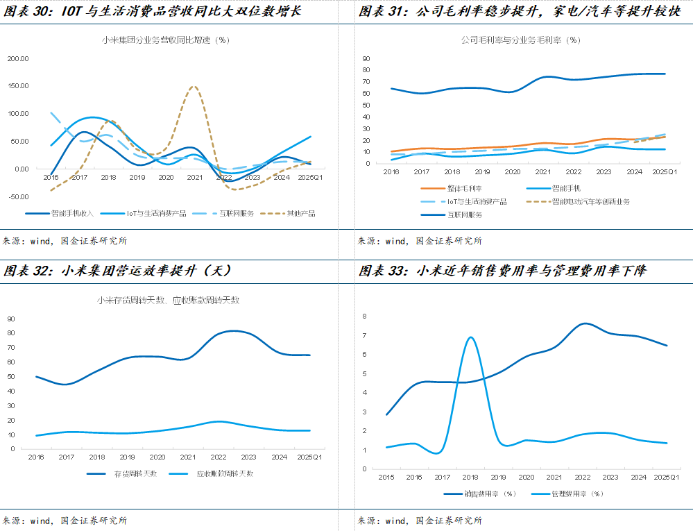 25Q1小米大家电营收同比113.8%,出货量角度空调同比增长65%+、洗衣机同比增长100%+、冰箱同比增长65%+,大家电板块量价齐升。小米经过核心零部件自研、产品自研、渠道效率提升、手机/车的高端化带来品牌力提升后,开始展现该业务板块的alpha。目前小米大家电业务虽增速较高,但仍处于1-10阶段,随着公司高端品牌建设与自有产能投放,该业务有望实现持续高速增长。