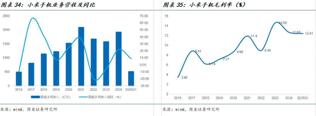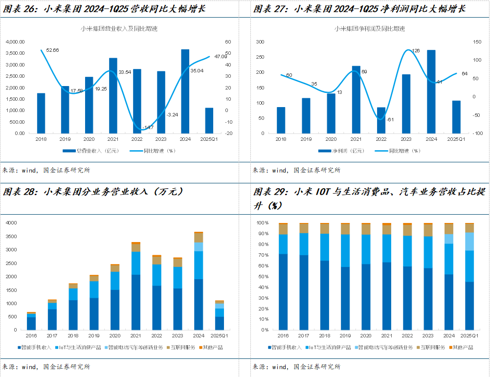 凭借稳健进取的经营策略和不断积累的自身能力,小米集团在2024年及25Q1各项业务均实现高速发展。2024年,小米集团总收入3659亿元人民币,创历史新高,同比增长35%,其中手机xAIoT分部收入3332亿元人民币,同比增长22.9%,智能电动汽车等创新业务分部收入328亿元人民币;2024年集团经调整净利润为人民币272亿元人民币,创历史新高,同比增长41.3%。2025年一季度,小米集团业绩持续亮眼,收入1113亿元人民币,同比增长47.4%;毛利率提升0.5%至22.8%;净利润经调整107亿人民币,同比增长64.5%。