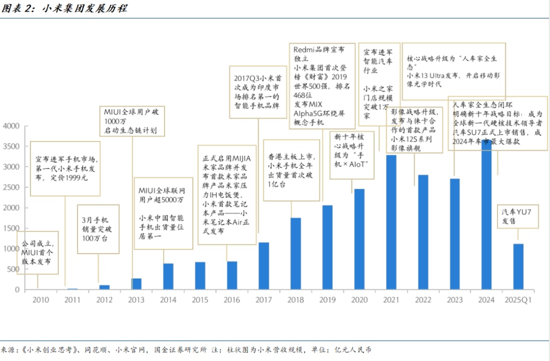 小米集团所涉足的手机、汽车、泛家居行业均处高度成熟的市场,在传统β行业中小米凭借自身的α,实现破局。小米集团自2010年成立至今短短15年,已成长为市值过万亿、兼具规模与弹性的全球科技消费蓝筹。25Q1再创历史新高,营收1113亿元人民币,同比增长47.4%;经调整净利润107亿元人民币,同比增长64.5%,毛利率22.8%,同比提升0.5%。同时释放亮眼成绩:
