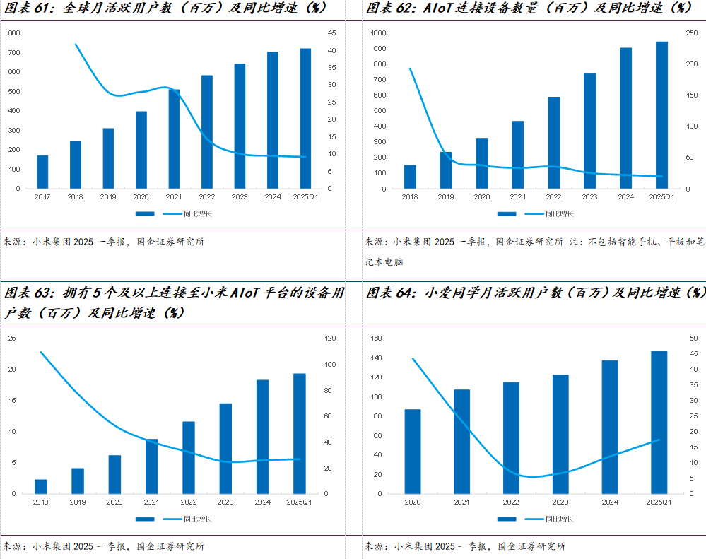 同时,小米视手机为移动互联核心入口, 2014年发布IoT连接协议,手机由单一终端升格为生态总线。2024年小米14系列搭载澎湃OS,实现AIoT设备丝滑转化,入口价值跃迁。截至25Q1小米互联网全球月活跃用户数达到7.19亿,同比增长9.2%,其中大陆月活1.81亿。
