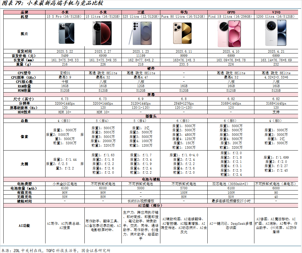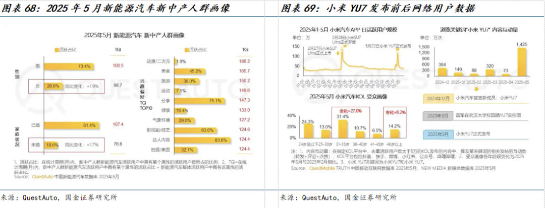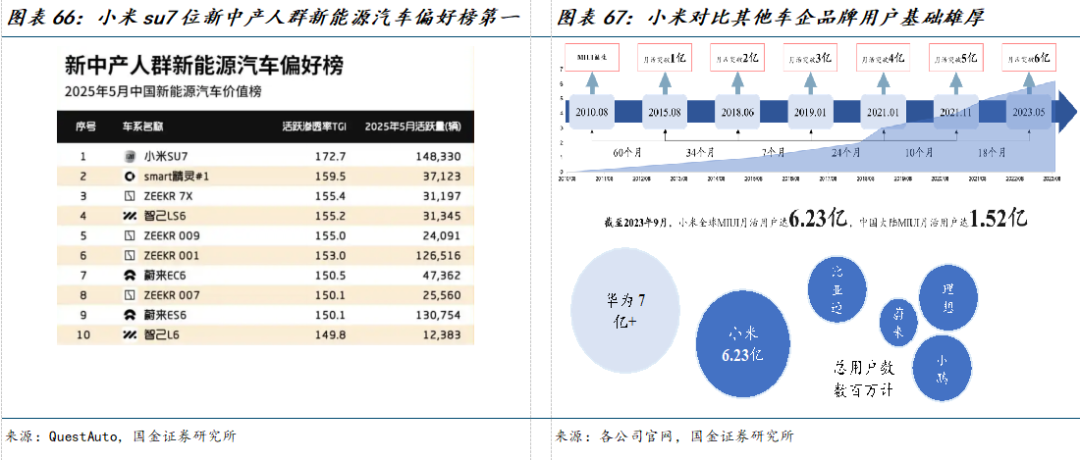 汽车业务发展,正推动小米品牌形象向高端化、科技化转变,实现品牌扩圈与用户画像迁移。过去,小米品牌在年轻、性价比导向用户群体中影响力大,此前小米的消费群体标签多为:发烧友、线上销售、男性、中低价位。早期核心用户为20-35岁男性,月收入3000-8000元的“参数极客”;未来五年,伴随小米汽车产品线丰富,预计将增加高净值用户数, 提升用户中高收入群体比例,进一步拓展高端市场份额,带动手机、AlOT 产品向高端化进阶。