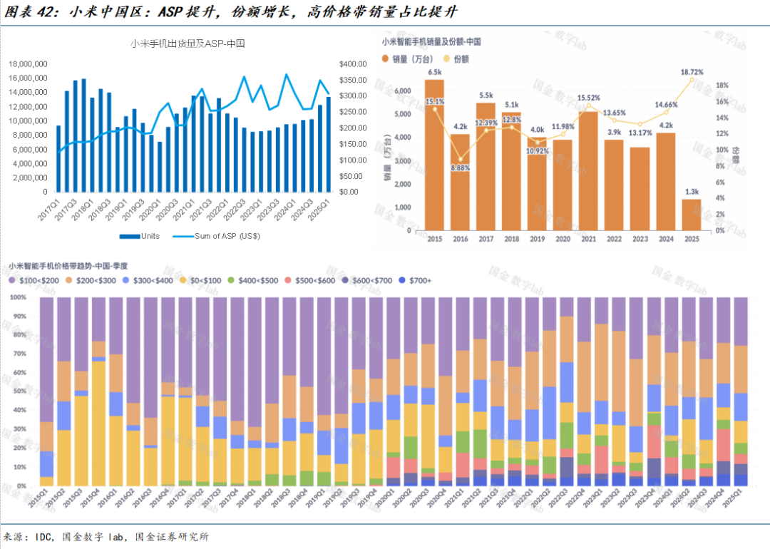 中国区市场取得亮眼成绩:25Q1出货量重回第一,出货量达1330万台,市场份额飙升至18.8%。主要得益于高端化战略的再次突破、以及双品牌策略的持续推进。高端产品方面,公司于2024年7月发布Xiaomi MIX Fold4和小米首款小折叠Xiaomi MIX flip,2024年10月发布Xiaomi 15系列,2025年2月发布Xiaomi 15 Ultra(3月海外市场发布)。系列高端产品在时尚科技、旗舰性能、影像、电池、屏幕、重量等全方位提升用户体验。高端智能手机使得公司产品结构优化,ASP创历史新高,25Q1达1211元;小米手机在中国大陆地区3000元以上机型出货量占比大幅提升,23年-25Q1分别为20.3%、23.3%、25%;4000-5000元智能机市场份额同比提升4.6%至24.4%,排名第一。