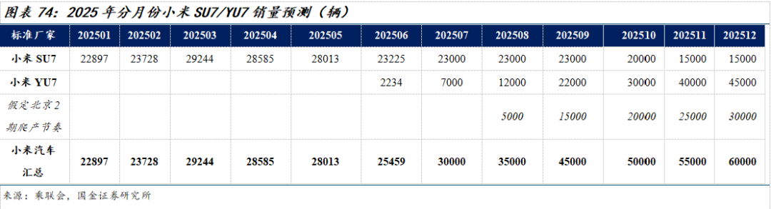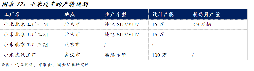 而在产能角度:1)当前的北京工厂一期、二期均用于生产小米纯电两款产品,且均可共线生产。从此前的满产满销可以大概看出,小米北京工厂一期的极限月产能在2.9万辆左右,年化约为35万辆/年;二期产能与一期类似,且可以共线生产;由此,我们预计一期二期产能60万辆以上,用于生产SU7和YU7。
