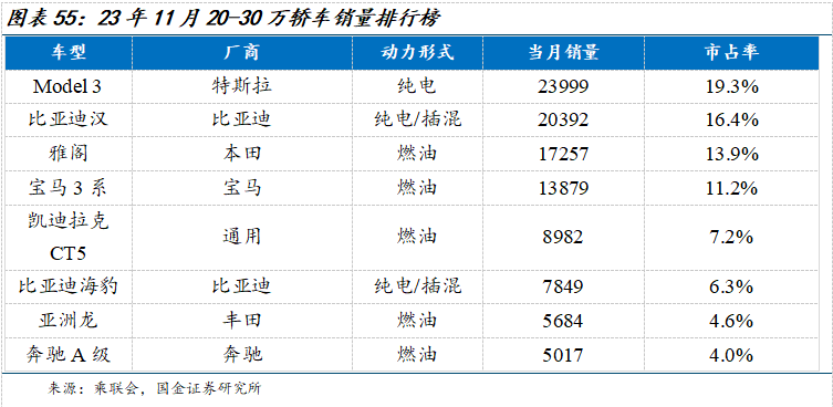 纯电车在产品上的不足影响到了纯电轿车的普及。在小米SU7上市之前,20-30万纯电轿车仅有特斯拉Model 3一款爆款,加剧了市场对纯电轿车市场空间的忧虑。23年11月,纯电轿车国内总销量5.0万辆,渗透率40%,其中特斯拉销售2.4万辆,占比40%。曾被寄予厚望的比亚迪海豹、小鹏P7等表现均不佳,当月销量7849/3106辆,不得不采用降价手段维持销量稳定,而剩余车型销量均未超过3000辆。彼时市场仍以燃油车为主,宝马3系、凯迪拉克CT5,大众CC等传统燃油车型占据了主流市场。