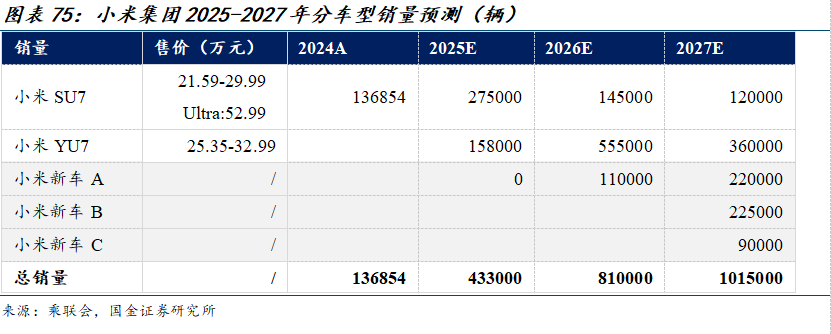 综上所述,我们将以上销量预测数据加总,最终预计25/26/27年小米汽车销量分别为43.3/81/101.5万辆,汽车业务伴随新车矩阵的持续完善将快速增长。