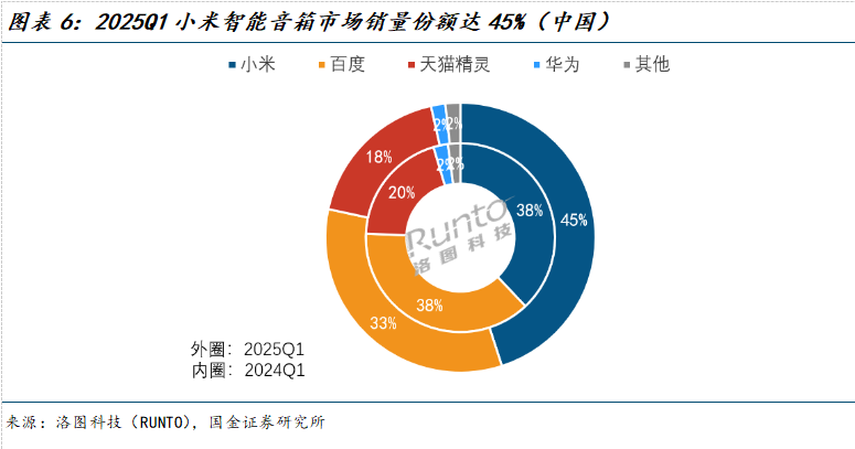 智能音箱作为AIoT的语音入口与场景联动枢纽,是小米切入智能家居的重要抓手。依托小爱同学的语音识别技术,小米智能音箱实现与IoT多设备协同响应,截至2024年,小爱同学月活跃用户数突破4亿,成为家庭场景中最活跃的移动互联入口之一。中国智能音箱自2018年以来形成小米、百度、天猫精灵三足鼎立的市场格局,TOP3品牌份额始终维持在90%以上,25Q1更是增长至96.5%,处于极高的寡占水平。其中小米保持强势,凭借其生态优势和新品“小米智能音箱Pro”上市的推动,25Q1全渠道市场销量份额达45.0%,较去年同期大幅增长7.1个百分点。