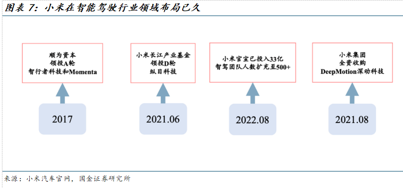 产业布局由来已久。在正式造车之前,小米主要以雷军个人及旗下顺为资本对新能源汽车行业进行股权投资:整车主机厂领域曾先后于2015年投资蔚来、2019年投资小鹏等头部造车新势力企业;智能驾驶板块2017年顺为资本领投智行者科技和Momenta两家自动驾驶公司的A轮融资、2021年6月小米长江产业基金领投ADAS提供商纵目科技的D轮融资、2021年8月小米集团以5亿元全资收购智驾公司DeepMotion(深动科技)。据不完全统计,至2020年小米系资金累计已投资超20家汽车产业链企业。