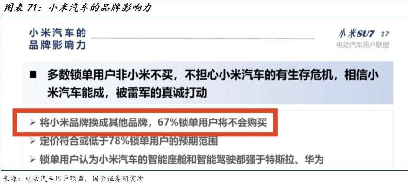 公司品牌效应、营销能力卓越,爆款概率极高:1)小米在汽车业务的核心竞争优势就是其强大的品牌效应和营销能力,由此带来了极高的热度和流量,品牌力远胜于一般车企,以电动汽车创新联盟的调研结果来看,67%的车主表示“若将小米品牌换成其他品牌,用户将不会购买”,并为雷军的真诚所打动。因而小米的汽车产品成为爆款的概率极高。2)此外,小米汽车在外观、产品细节等方面具备设计优势,能更好的提供情绪价值,形成情绪消费效应。我们认为,在以上特质下,小米汽车后续新车的爆款概率仍极高,或仍存在供不应求的情况。