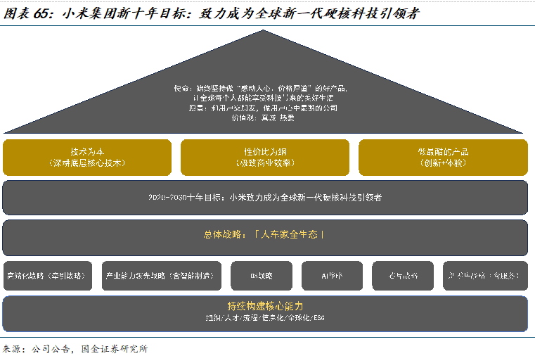 新十年新征程,小米在2020年提出下一个十年,核心战略将升级为“手机X AIoT”,重申永不更改的三大铁律——技术为本、性价比为纲、做最酷的产品,以及新十年发展的三大策略:重新创业、互联网+制造、行稳致远,并在后续的财报、发布会及雷军公开信中进一步明确了方向。在战略规划层面,小米在2023年将核心战略进一步升级为“人车家全生态”,此后将总体战略的实现路径拆解为高端化战略、产业能力领先战略、AI战略、OS战略、新零售战略等六大子战略。2024年,小米明确了新十年的奋斗目标,即成为全球新⼀代硬核科技引领者。