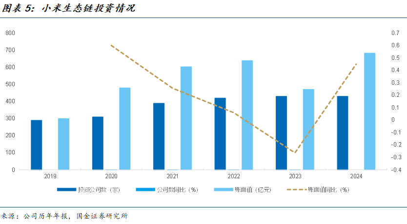 2013年小米敏锐捕捉到智能硬件和物联网商机,以“投资+孵化”模式,由小米输出做产品的价值观、方法论和已有的资源,帮助生态链企业在细分领域脱颖而出。2014年小米明确“1+4+X”智能互联业务策略,以手机为唯一核心,以智能电视、路由器、智能音箱、笔记本为四大枢纽,其余海量IoT设备X则交由生态链与合作伙伴共同补位。截至2024年底,小米投资的生态链企业为430家,总帐面价值达683亿元。2024年底IoT平台连接设备数(不包括智能手机、平板、笔记本电脑)为9.05亿,同比增长22.3%。