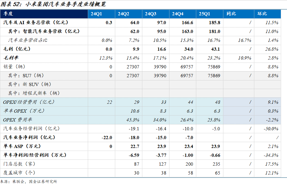 Q1汽车业务毛利率23.2%,同/环比+10.9pct/+2.8pct;其中汽车业务亏损5亿元,我们计算公司Q1单车亏损0.67万元。主要来自于年降到位以及小米SU7Ultra的交付,使销量结构性改善,进一步扩大其毛利率水平。此外,小米公司在汽车业务上具有很强的成本控制能力,如SU7标准版与Ultra版共用产线等。但是由于公司汽车业务费用端仍在持续扩张,本季度已经达到48亿元,导致公司实际上汽车业务净利润仍未扭亏。但整体看,公司汽车业务依旧实现了强势增长;在后续YU7交付后上量的情形下,汽车业务有望实现快速盈利。