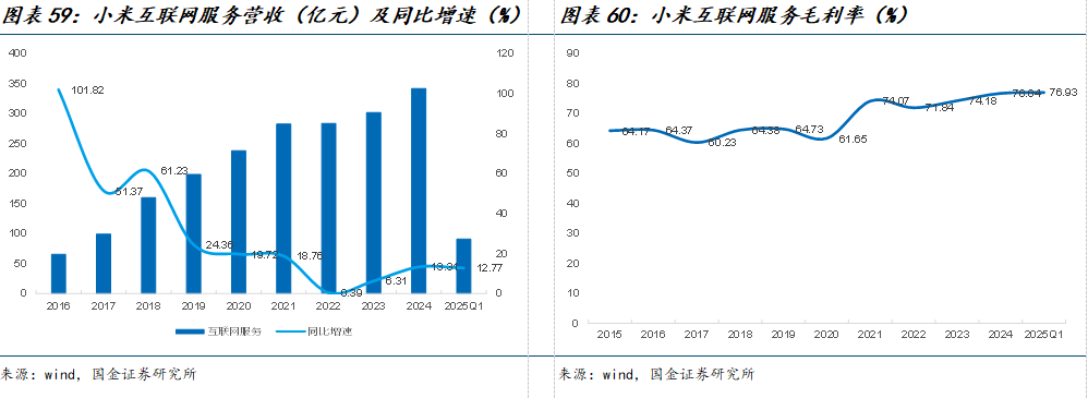 2024年小米互联网业务收入达341亿元,同比增长13.3%,创历史新高。其中境外互联网服务收入同比增长30.0%,达110亿元,在整体互联网服务收入中占比增至32.2%。得益于小米手机的出货规模以及规模领先的消费级IOT平台。25Q1小米全球月活跃用户数突破7亿大关,设备连接数超9亿台,为互联网业务提供了庞大的用户基础。