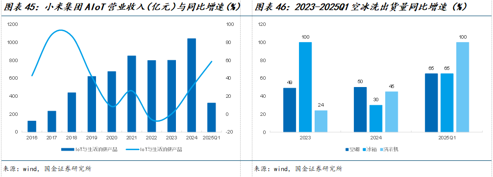 小米构建了全球最大的AIoT生态系统,截至2024 年,AIoT设备连接数近9亿台。2024年该业务营收同比增长30.0%,达1041亿元,首次突破千亿规模。其中智能大家电业务全面爆发,空调、冰箱与洗衣机出货量均创历史新高,空调出货量超680万台,同比增速超50%;冰箱出货量超270万台,同比增速超30%;洗衣机出货量超190万台,同比增速超45%。2025Q1,IoT与生活消费产品业务收入达323亿元,同比大涨58.7%,再创历史新高。