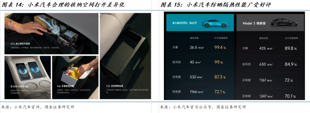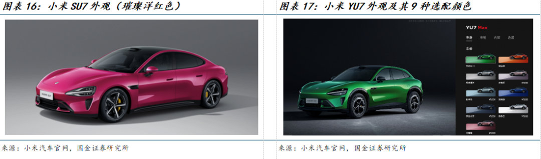汽车:传统车企偏向于宣传三电动力、底盘悬挂、平台架构等技术要素,小米更偏向于宣传产品的实用性小功能:在SU7上,在速度角度上的宣传更直观,同时着重宣传了其全景天幕的隔绝效果和储物空间,以及其汽车配件的延展性,如屏幕实体按键、屏幕小仪表、车用手机支架等,更贴近消费者需求;在YU7上,宣传重点则变为前排的双零重力座椅(适用于中午休息情形),并重点宣传高配配备的静谧隐私玻璃,强化小米YU7的家庭用车属性。此外,小米在外观颜色上参考传统超豪华车型,具备大量可选颜色,进一步发挥了其外观的优势作用和在消费者心中的情绪价值。