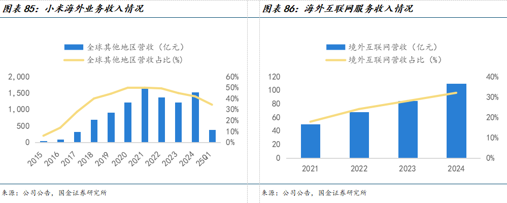 海外市场是小米集团重要的增长极。2024年小米海外营收突破1533.44亿元,占总收入的41.9%,其中境外海外手机×AIoT占整体手机×AIoT营收的46.0%;境外互联网收入为110亿元,同比增长30%,占整体互联网业务32.2%。