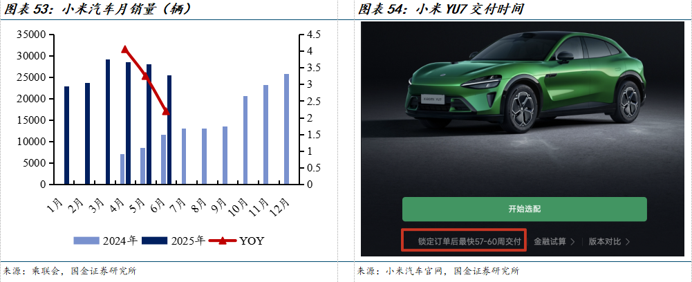 SU7于2024年3月28日正式上市,定位C级纯电轿跑。新车发布后,4分钟大定破万,7分钟大定破2万,27分钟大定破5万,大超预期,成为2024年车市最大爆款。25年6月,共计销售汽车25429辆,同比+219.2%,环比-9.2%,环比下滑系二期工厂尚未投产,因而SU7部分产能用于YU7试生产,因而事实上仍然满产满销,24年3月上市至25年6月,小米实现累计交付29.5万辆,表现极为强势。