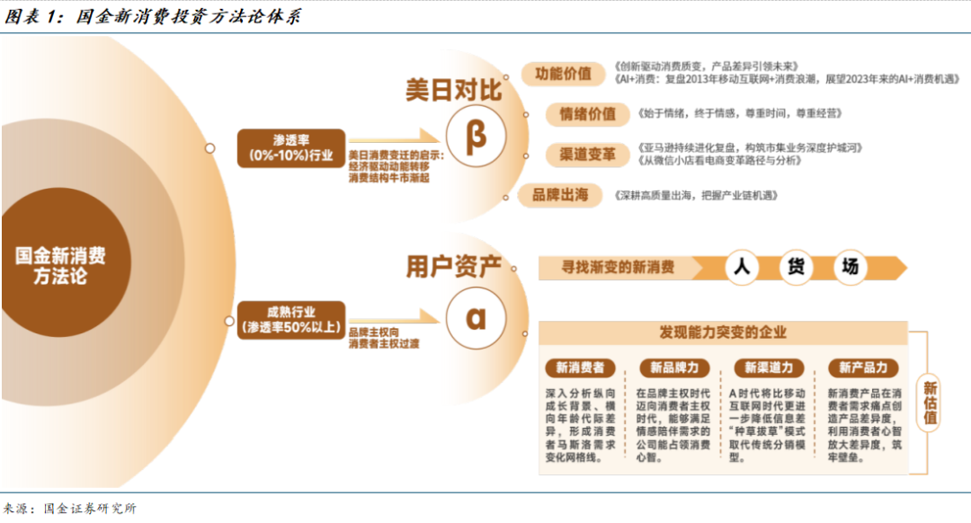 品牌主权向消费者主权时代过渡,需求思维打造新消费龙头。国金新消费的长期投资方法论构建了“赛道β + 突变α”的投资方法论体系。其中,赛道β方法论于2024年底在报告《美日消费变迁的启示:经济驱动动能转移,消费结构牛市渐起》中阐述,明确了在城镇化率放缓的宏观背景下,如何精准捕捉消费行业崛起的机会,重点关注渗透率从0到10%,乃至到30%-50%的行业提升机遇。突变α投资策略则关注渗透率50%以上的成熟行业,挖掘传统行业中体察“人-货-场”变迁,从而打造新品牌、新产品、新渠道的企业。