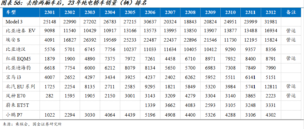 放大到纯电轿车整体,彼时销量能稳定破万的纯电三厢轿车,也只有比亚迪秦EV和埃安S两款主打网约车的车型。23年销量前十中有五款为营运车型(网约车、出租车,主要来自补贴和纯电网约车拥有更高的经济性)。