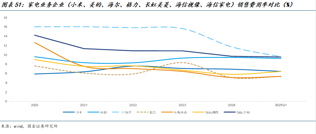 比较小米IoT与生活消费产品与家电类公司相关业务毛利率变化可以清晰看到,多数企业的家电类产品毛利率趋势向下,而小米IoT与生活消费产品的毛利率在稳步增长。9年间小米IoT与生活消费产品的毛利率由0.4%增长到20.26%,毛利率增长近20个百分点。而小米的销售费用率相比家电类企业处在较低的位置,并且在24-25Q1其他企业趋势向上的时候仍然保持销售费用率的持续下降。