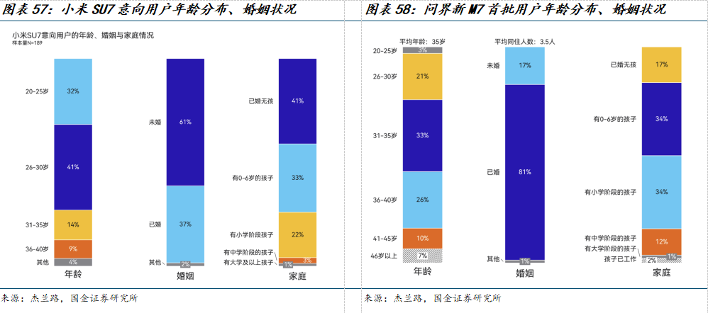 小米在宣传中更直击消费者痛点。小米的消费者大多为年轻群体,未婚、已婚无孩用户,无家用属性的购车需求。20-30岁用户占比73%,未婚占比61%,已婚无孩占比41%。实际锁单用户略有差别,据电动汽车用户联盟2024.4.28公开的其对小米SU7的183位锁单用户的调研,小米SU7实际锁单用户81%为90后,均龄31岁,未婚和已婚无孩占比63%。这部分群体一方面更重视产品体验,另一方面消费情绪效应明显、且对汽车硬核技术、参数等信息并不敏感。