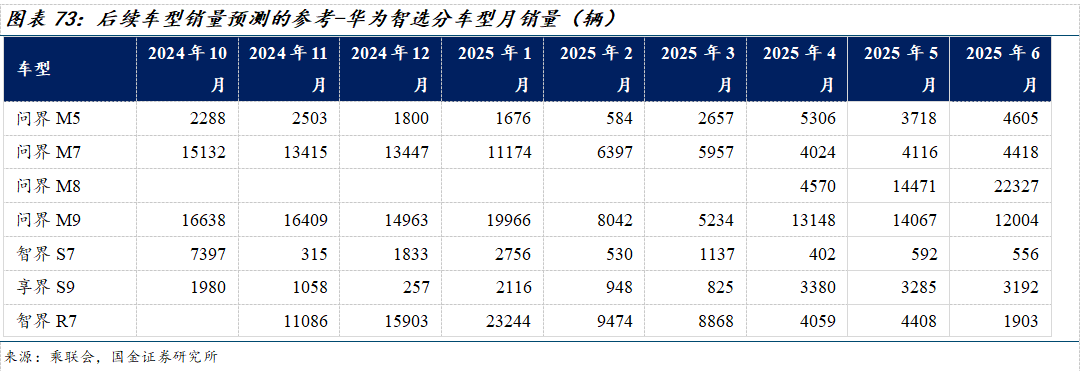 综上所述,我们可以对销量预测做出几点假设:1)小米汽车后续新车虽然没有官方信息,但上市预计即为爆款,因此我们在对26-27年假定上市的新车预测中,按照市场已有的爆款车销量给定其月销量:考虑到双方在用户群体、跨界造车和流量上的共同性,我们以华为智选为例,根据乘联会口径的数据,目前问界M8目前月销量在2万辆左右,M7等最高月销在2-3万辆,M9稳态月销在1.3-1.5万辆之间;由此我们给定后续小米几款新车早期2-3万辆月销,稳态1.5-2.5万辆月销量的销量预期。