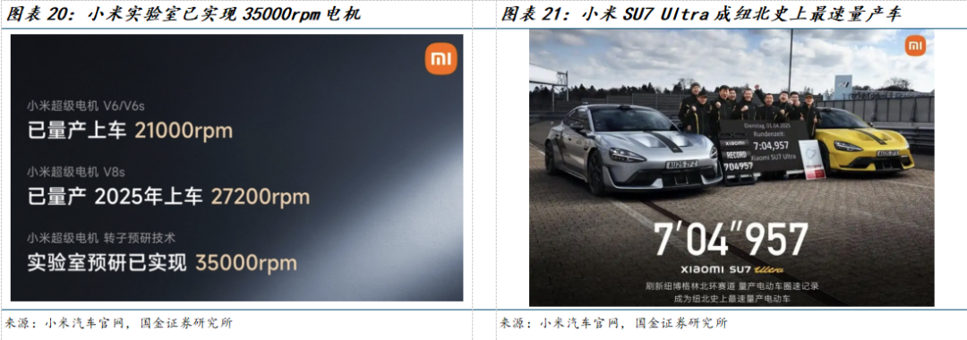 汽车:精准定位运动属性,主打驾控加速技术。小米汽车的首款发布会着重介绍其V6/V6s和V8s三款电机,其中V6/V6s转速可达21000rpm,V8s可达27200rpm。因而SU7 MAX版便拥有同级别最快的2.78s零百加速,将中大型轿车零百加速时间压缩至3秒内,价格下沉至30万以内。SU7 Ultra采用三电机,系小米V8s电机首次搭载在量产车上,零百加速1.98s,但售价仅为52.99万元。
