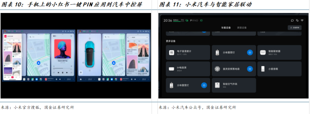小米以移动智能空间重新定义汽车价值。小米汽车落地代表人车家全生态正式闭环,Xiaomi Hyper Connect 协议覆盖用户95%以上生活场景,小米澎湃OS的诸多特性和完备流畅的生态体验,将全部在小米汽车上实现。软件层面跨端智联,小米澎湃智能座舱在设计之初就将手机、平板视为座舱的一部分,实行多端一体化原生设计,给予车机使用手机全部生态应用的潜力。硬件层面,米家设备可在车上免密链接、直接使用,同时CarloT生态在汽车中控大屏、储物台、座椅后背等位置均支持硬件拓展,即插即用,生态扩张无需二次配对,将汽车转化为可移动的IoT边缘节点。