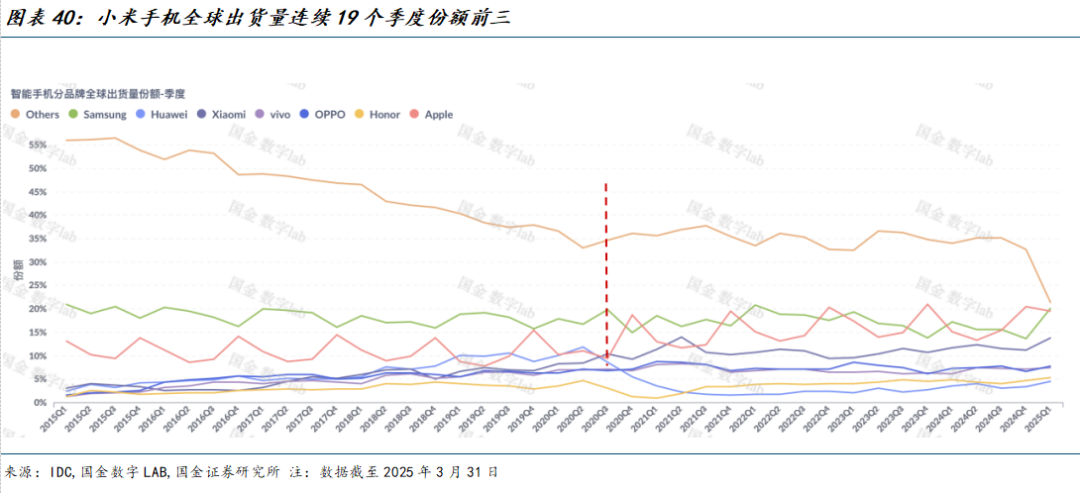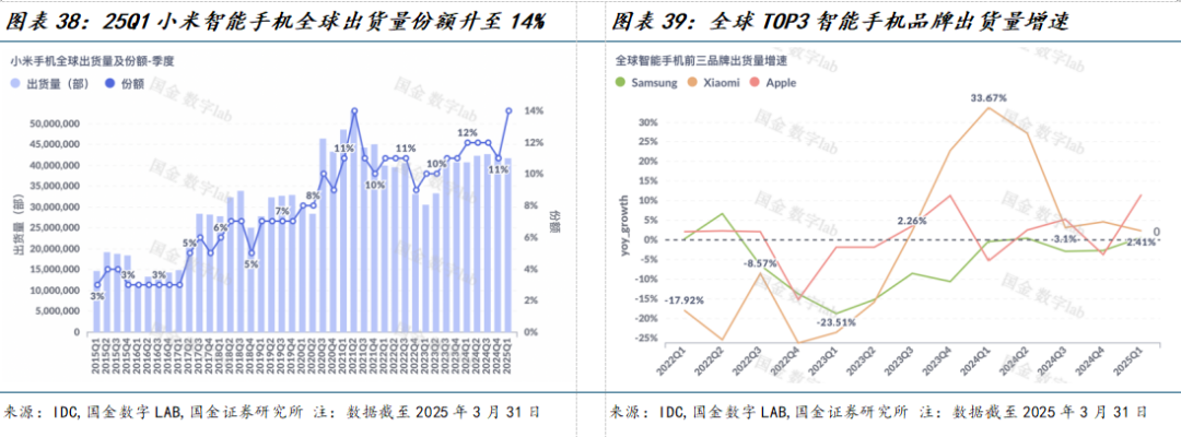 小米于2014年即启动海外业务,截至2025Q1,小米智能手机份额在全球58个市场排名前三,在68个市场排名前五。