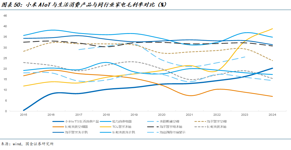 大家电相关业务实际上竞争非常激烈,而小米能有稳步向上的毛利率、趋势向下的销售费用率,得益于其生态链的成熟,在此基础上全渠道能力、完善的供应链能力、用户洞察和售后等体现出系统的质变。