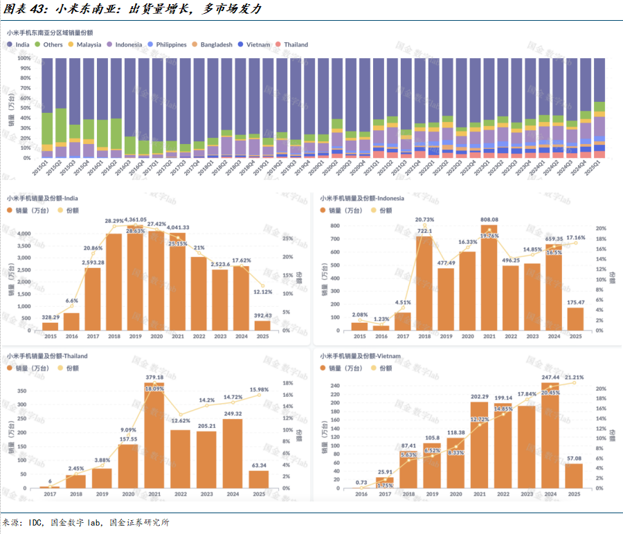 东南亚市场看,市场结构不断优化。从单一印度大市场,到印尼、马来西亚、泰国、越南等市场全面推进。25Q1印尼手机份额增长至17.16%,泰国15.98%,越南21.21%;出货量同比均有较大幅度增长。