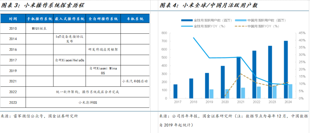 财务与运营双重高增一方面反映小米阶段性成功,同时也指向未来弹性。为何在全球经济增速放缓、逆全球化趋势不断显现的情况下,小米还能爆发出如此巨大的增长动能?我们认为,小米的成功是互联网思维、生态链模式、用户共创、技术积累等多维共振的,核心是一以贯之的“极致效率”。具体而言,是从极致效率出发,展现优秀战略定位能力和超强执行力:选择适配移动互联行业的合伙人及团队、在多个产业及自身发展关键节点精准卡位或快速纠错、在研发、制造、用户触达与反馈上寻找最优最快解。由此,小米逐步构建了一个以深厚优质用户资产为底座,以可支撑并引领高端化的一梯队技术为中坚,以人-车-家全场景生态的飞轮式互哺为放大器,以国内验证、海外复制的双循环商业范式为扩张引擎的体系,具备持续自我进化的长期生命力。