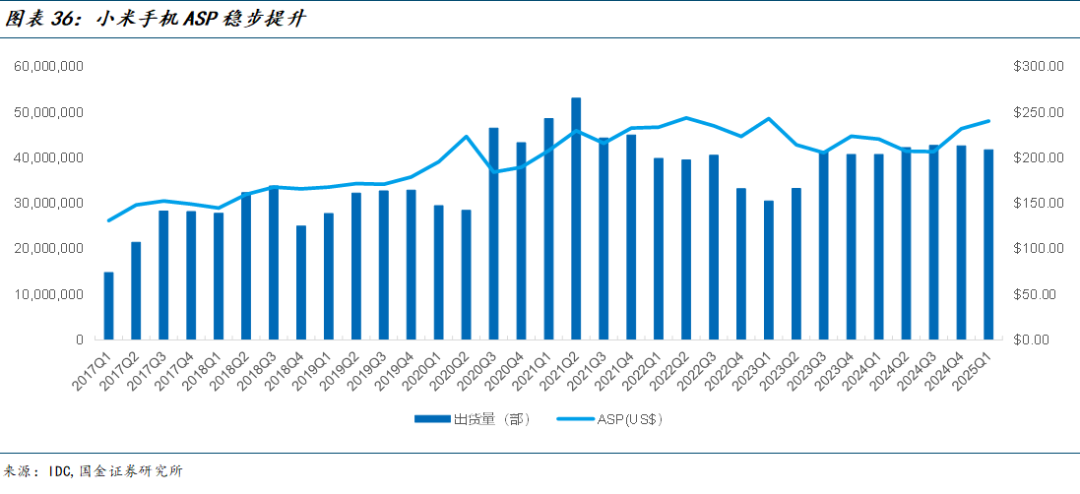 智能手机为小米核心产品,是其实现人车家全生态的核心入口。2024年小米智能手机市场份额达13.8% ,成为全球前三厂商中唯一实现正增长的品牌,持续缩小与苹果、三星的差距。2024年小米智能手机收入同比增加21.8%至1918亿元,量价齐升。出货量同比增长15.7%,同期全球智能手机出货量增长7.1%,大幅跑赢大盘,主因其全球化的精细化运营;ASP同比增长5.2%至1138.2元,主因持续的技术投入和产品策略调整、全球市场高端智能手机出货量占比增加。