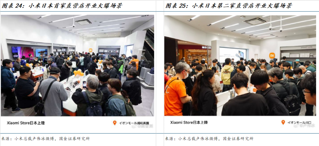 以日本市场为例,小米今年3月13日在日本市场一次性发布了超过10款新品,包括小米15、小米15 Ultra、小米平板7系列、小米Buds 5 Pro等。除手机数码产品之外,还在日本推出无线吸尘器、小米智能摄像头、小米路由器、小米智能体重秤S200、空气炸锅,产品阵容十分全面。小米今年已分别于3月22日、4月5日开设两家直营店,均呈现火爆态势。日本小米之家与国内门店几乎没差别,售卖小米手机、小米电视、小米穿戴产品、小米充电宝以及米家生态链等产品。小米智能手机和智能电视的畅销,带动了扫地机器人、智能音箱和空气净化器等多种IoT设备的销售。