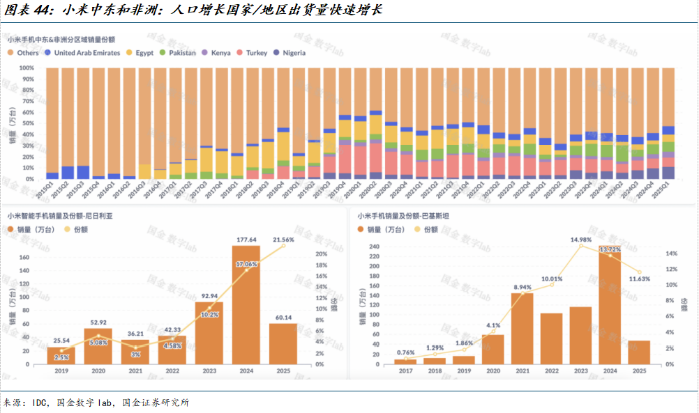 中东和非洲市场亦有挖掘增长较快市场做区域调整。数据来看,人口持续增长的尼日利亚、巴基斯坦等市场小米手机出货量大幅增长。尼日利亚23年出货量92.94万台,同比增长119.56%;24年出货量177.64万台,同比增长91.13%;23-25Q1份额同比增长了5.62个百分点、6.86个百分点、4.50个百分点。巴基斯坦24年出货量241.93万台,同比增长107.54%。