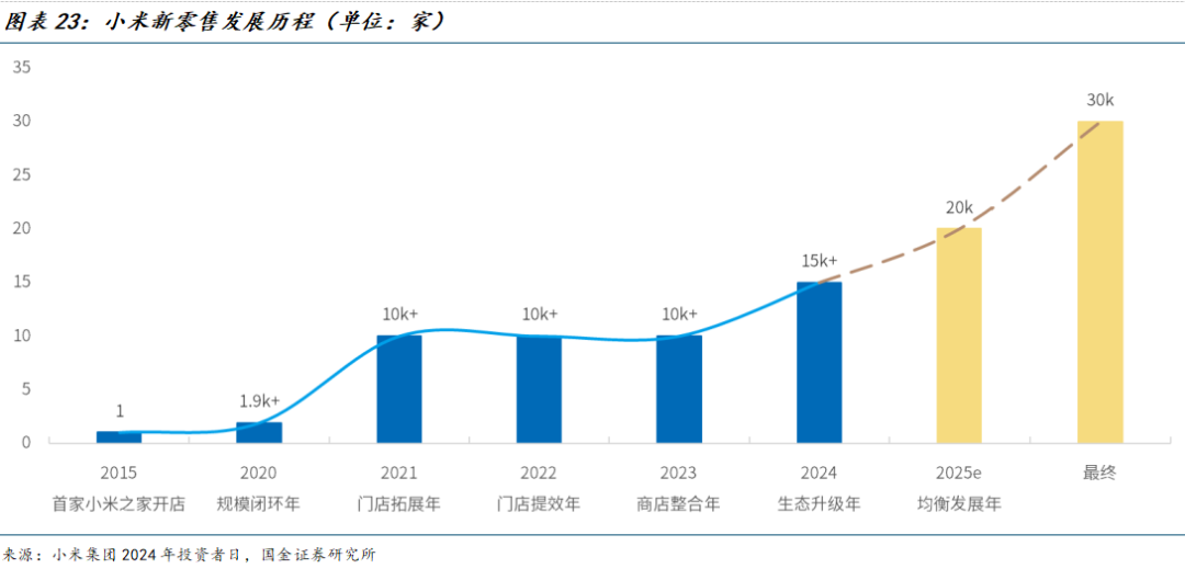 小米新零售模式在经历国内2017-2024探索拓展提效升级后,未来具备向海外输出模式的可能。小米计划未来五年海外目标店铺一万家,致力于推动新零售模式的全球化发展,助力小米手机、家电、IOT及车出海。小米将在海外拓展更多产品品类,智能大家电空调已在东南亚市场开售且销量良好,下半年开始出海欧洲,后续冰箱、洗衣机等大家电产品也将有序出海。IoT方面,截至2024年10月,小米澎湃OS的跨端智联技术已经连接了全球10亿多台设备,有望带动其他品类销售。