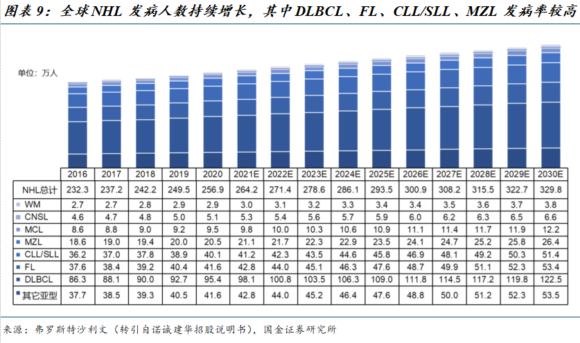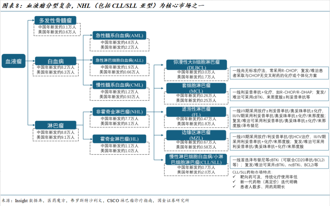 血液瘤分型复杂,NHL为核心市场之一。血液肿瘤指来源于造血细胞的恶性疾病,常累及骨髓、血液及全身各个脏器和组织。根据发病机制及表现不同,临床常见的血液肿瘤主要包括淋巴瘤、白血病和骨髓瘤。非霍奇金淋巴瘤(NHL)占淋巴瘤约90%,其常见亚型包括弥漫性大B细胞淋巴瘤(DLBCL)、套细胞淋巴瘤(MCL)、慢性淋巴细胞白血病(CLL)、小淋巴细胞白血病(SLL)、滤泡性淋巴瘤(FL)、边缘区淋巴瘤(MZL)等。其中,DLBCL、MCL、MZL、FL等B细胞淋巴瘤的常用治疗手段为利妥昔单抗(专利已过期)和CHOP(环磷酰胺+长春新碱+多柔比星+泼尼松)为代表的传统化疗方案,而CLL/SLL近年来得益于BTK抑制剂等靶向疗法的重大突破,患者获益进一步改善,创新药催动市场规模持续提升,成为血液瘤的重要市场。