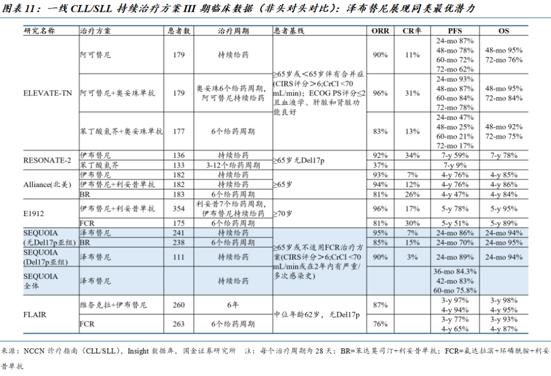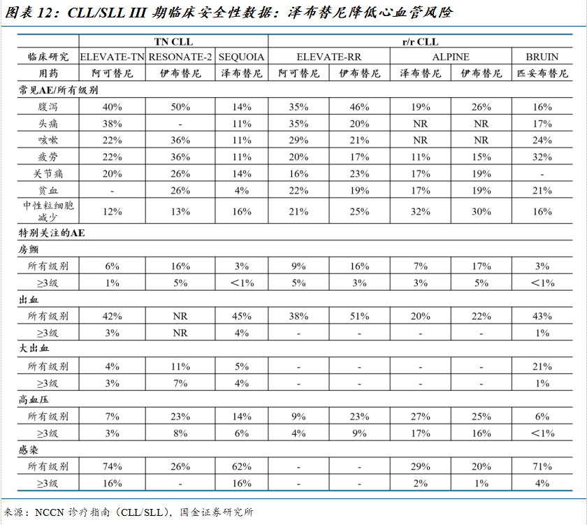 一线持续治疗数据优异,跻身指南首位关注。目前针对初治CLL/SLL的治疗模式可分为两大类:(1)以BTKi单药为代表的持续治疗(终身服药直至患者出现疾病进展或复发);(2)免疫化疗、或BTKi联合其他强效疗法为代表的固定周期治疗(Fix duration,症状实现治愈后停药)。BTKi单药治疗数据中,泽布替尼60-mo PFS率达75.8%(SEQUOIA研究),相比伊布替尼48-mo PFS率76%(Alliance研究)、阿可替尼60-mo PFS率72%(ELEVATE-TN研究)具有优势(非头对头对比)。在安全性方面,泽布替尼相比伊布替尼显示出更优的安全性,尤其降低了房颤等心血管风险。泽布替尼进而在各大临床指南中取代伊布替尼,跻身首位关注。
