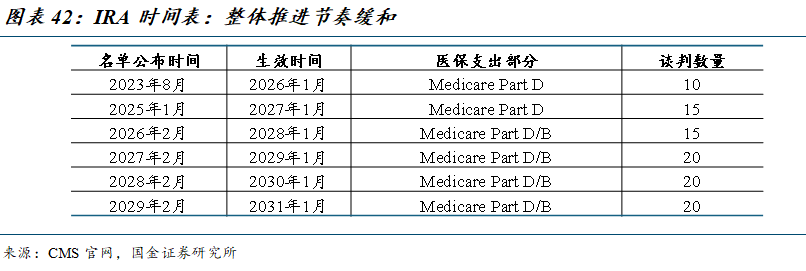 IRA法案中药价谈判的推进节奏相对缓和:美国政府于2022年《通胀削减法案》(IRA),首次引入联邦医疗保险(Medicare)与制药企业直接谈判药品价格的机制,以强制降低美国药品价格。在推行节奏上,于2023年选定第一批10个Medicare Part D品种,谈判价格于2026年1月生效;2024年选定15个Medicare Part D品种,谈判价格于2027年1月生效;2026年选定15个Part B/D品种,随后3年每年选择20个Part B/D品种,价格两年后生效,法案的整体推进节奏较为缓和。