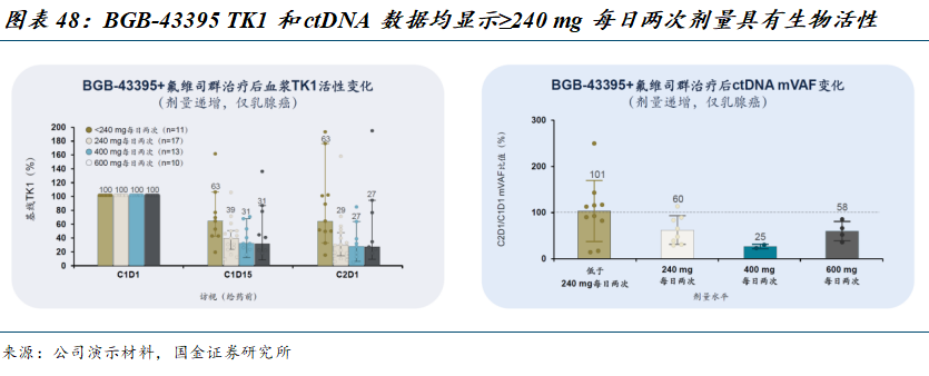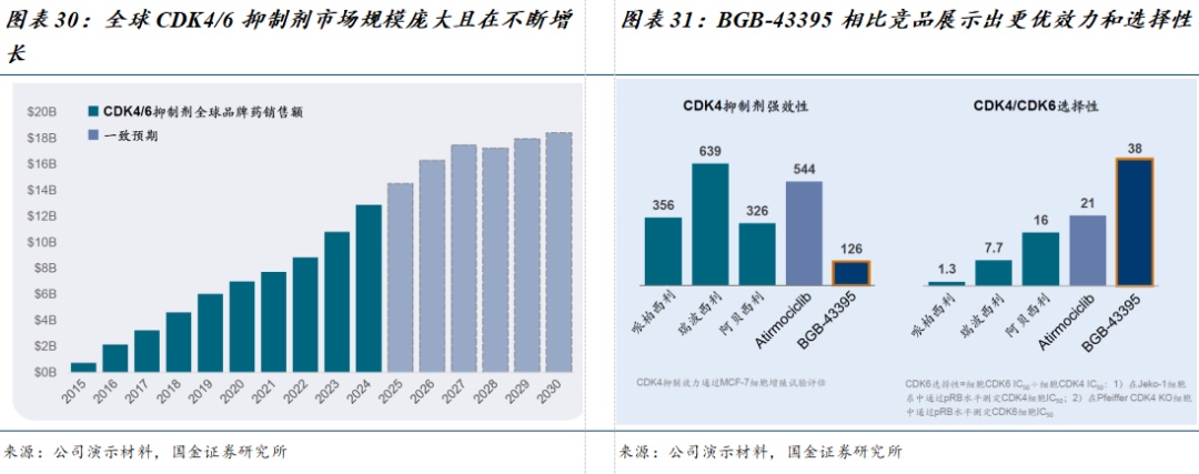 CDK4抑制剂:有望引领乳腺癌用药迭代。CDK4/6抑制剂是实体瘤治疗最大药物类别之一,当前市场规模约130亿美元且在不断增长。选择性CDK4抑制剂能够避免CDK6抑制和脱靶毒性,有望引领治疗迭代。公司研发的CDK4抑制剂BGB-43395在HR+乳腺癌一线治疗中已追平全球首款CDK4抑制剂Atirmociclib(辉瑞)的研发进度,且展现出同类最佳特征,在药效学有效剂量水平下血液学毒性较低。公司预计将启动针对HR+乳腺癌患者一线及二线治疗的III期研究,其中二线研究最早将于2025年第四季度启动。