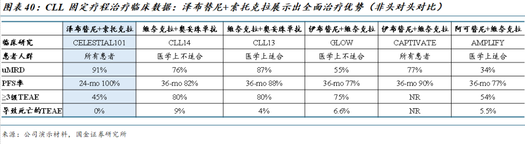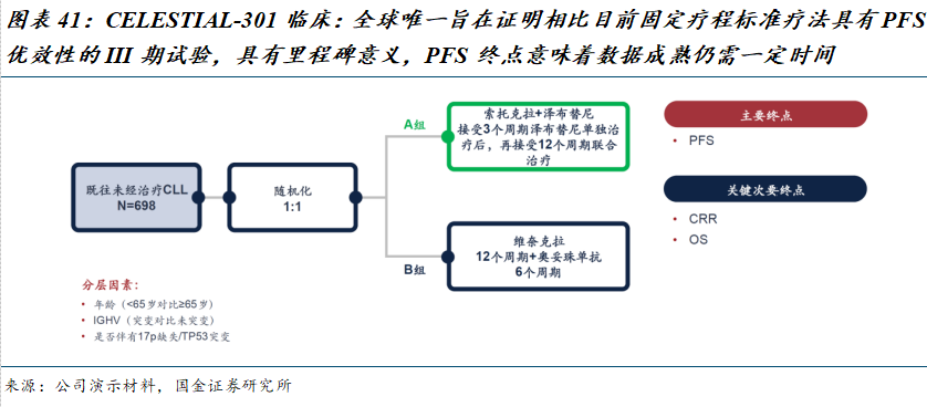 (2)销售发力错峰,Fix duration发力与泽布替尼的生命周期管理相契合。泽布替尼+索托克拉针对一线CLL的III期临床试验CELESTIAL-TNCLL(301)于2023月11月首例入组,2025年2月完成全部入组,主要终点为PFS,参考对照组维奈克拉+奥妥珠单抗在此前研究中的PFS(CLL14研究中5年PFS率76个月),我们预计数据成熟或仍需4年或以上。因此,泽布替尼+索托克拉方案获批一线CLL时泽布替尼已处于产品生命周期的中后期,联用方案的引入不挤占泽布替尼的市场,反而有望延长泽布替尼的生命周期。