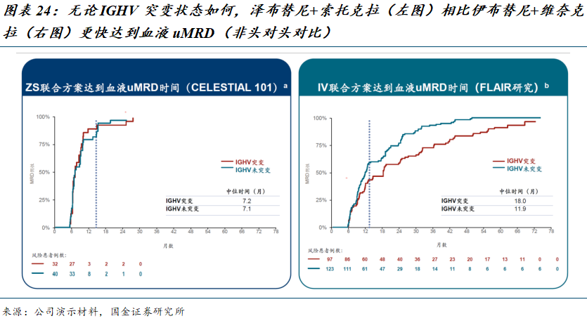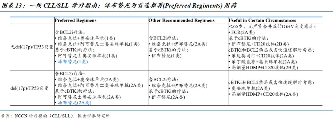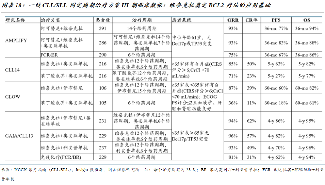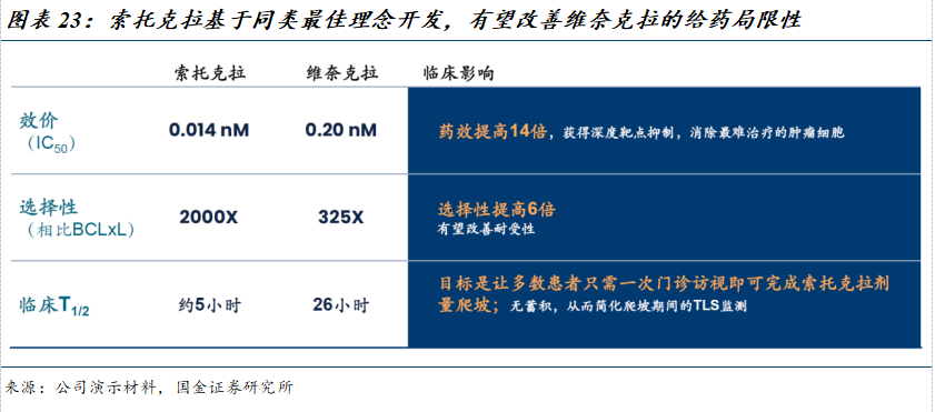 (3)响应不同患者需求,固定疗程与持续治疗不存在上下位替代关系。目前包含维奈克拉的治疗方案约占CLL新增患者的25%,但绝大多数使用于学术治疗,BTKi持续治疗仍占据主流。索托克拉显著改善维奈克拉方案的有效性、安全性,未来获批后有望扩大BCL2i的市场份额。相比BTKi单药治疗,BCL2i联合疗法虽然提供了停药的选择,但亦在治疗期内带来更大的毒副作用风险(包括TLS等),同时减少了未来潜在复发/耐药后的BCL2i治疗选择。BCL2i的迭代有望为患者提供更多治疗选择,届时可根据患者的身体状况、用药依从性、疾病风险等因素灵活选择具体的给药方案,实现患者整体生命周期的延长和更佳的管理。