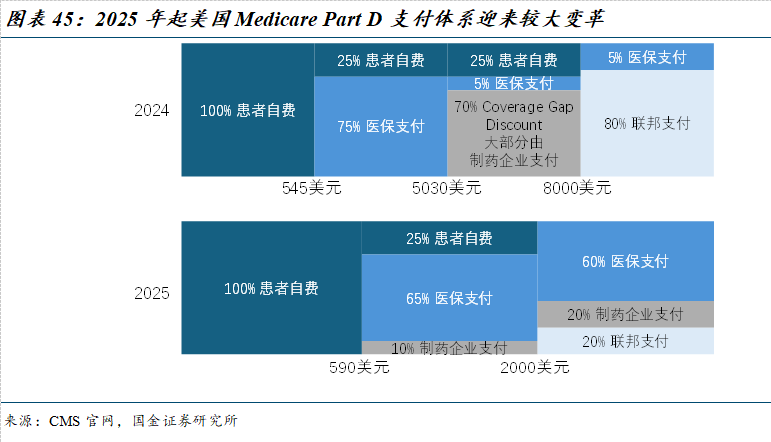Medicare Part D支付体系迎来较大变动。2025年起,美国Medicare Part D重新设定的支付体系正式执行,将患者需自费支付的治疗支出上限由8000美元下调至2000美元,同时大幅缩减了政府在高额支付部分中的承担比例,将费用义务转移给医保部门和制药企业。据辉瑞等制药企业测算,该方案的改革预计将对高价药品的销售产生不利影响(无上限部分中制药企业承担的比例由0%上升至20%)。