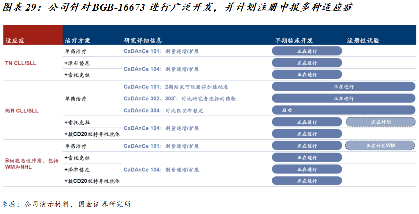 临床数据展现同类最优潜力,头对头III期临床彰显信心。BGB-16673在既往接受过多线治疗的R/R CLL患者中观察到显著缓解,针对共价BTKi+BCL2i经治患者、共价BTKi+非共价BTKi+BCL2i经治患者的ORR分别达90.5%、75%。在针对R/R CLL适应症的早期临床探索中,BGB-16673在患者治疗线数更高、既往BTKi和BCL2i暴露更充分的患者群体中仍展现出相较新一代非共价BTKi匹妥布替尼更优的PFS缓解(非头对头对比)。目前公司已开启针对既往接受过共价BTK抑制剂治疗的R/R CLL/SLL患者的全球III期研究,头对头匹妥布替尼,预计将于2025年下半年完成首例患者入组。目前公司针对BGB-16673进行了广泛的临床开发,并计划注册申报多种适应症,有望于2026年在全球范围申报CLL/SLL。