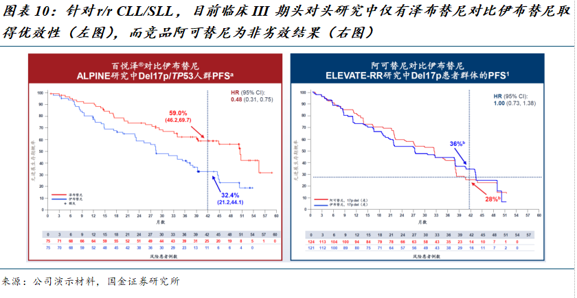 头对头击败伊布替尼,泽布替尼展现同类最优效果。近年来,以BTKi靶向治疗为主的方案逐渐成为 CLL/SLL全程管理的核心,推动CLL/SLL市场规模持续增长。泽布替尼以成为同类最佳为设计出发点,在针对r/r CLL/SLL的临床III期试验中头对头中胜出伊布替尼(Del17p/TP53人群42-mo PFS率59.0% vs 32.4%),成为目前唯一一款在说明书中包含用于治疗CLL患者取得对比优效性的BTK抑制剂。