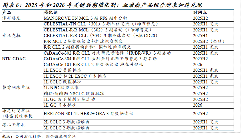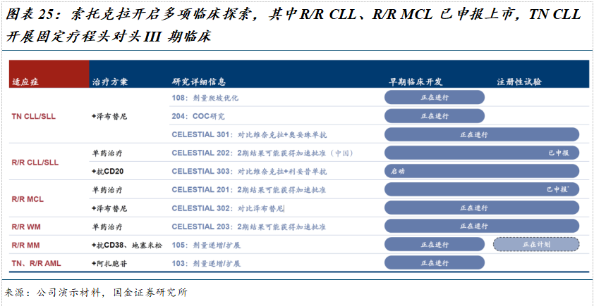 短期,有望通过快速获批通道加速上市:(1)索托克拉单药治疗R/R CLL/SLL已通过II期临床数据申报上市(仅中国);(2)索托克拉单药治疗R/R MCL已在通过II期临床数据在国内申报上市,预计在2025H2进行全球申报上市。