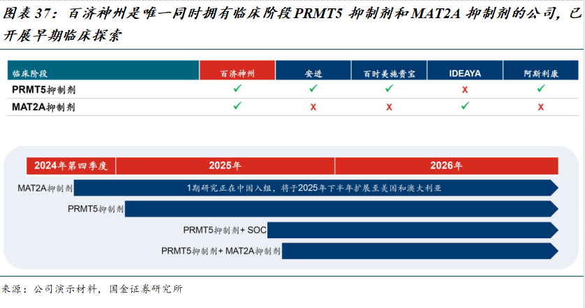 PRMT5和MAT2A抑制剂协同组合。PRMT5和MAT2A均为针对MTAP蛋白底物甲硫腺苷(MTA)机制的“合成致死”策略(即同时抑制两个非致死性靶点导致癌细胞死亡)靶点,具有较强的协同潜力。公司为全球唯一同时拥有临床阶段PRMT5抑制剂和MAT2A抑制剂的公司,目前两款产品均处于单药治疗剂量递增研究阶段,有望于2025H2开始进行联合给药探索,预计将于2026年完成联合用药的POC。