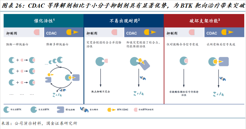 CDAC等降解剂技术有望提供多重治疗优势。BTK抑制剂、BCL2抑制剂等新兴治疗手段已为CLL等B细胞恶性肿瘤的治疗带来显著改善,但同时带来患者未满足的治疗需求的不断演变。尽管初治CLL患者治疗效果已经有所改善,但对复发CLL患者仍存在未被满足的临床需求。CDAC等降解剂有望为BTK通路靶向治疗带来新突破,以公司自主研发的BTK-CDAC BGB-16673为代表,相比传统的小分子抑制剂具有催化活性高、不易出现耐药等多重治疗优势,有望为CLL等血液瘤的治疗提供新选择。