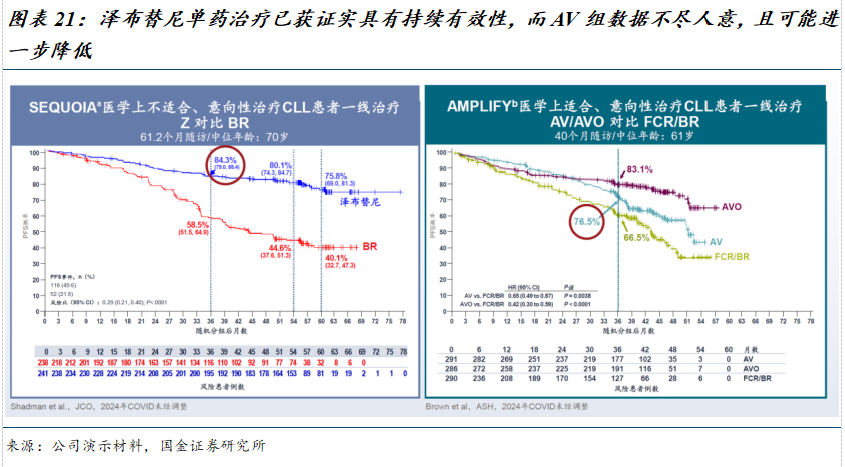 未展现出可比PFS:AV、AVO组的42个月PFS率分别约69%、82%,相比泽布替尼单药的持续治疗方案(83%)无提升、甚至可能降低PFS获益的持续性(非头对头对比);